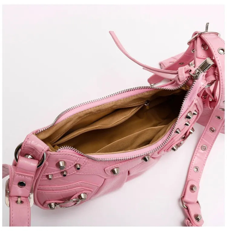 This isn't just a bag, it's a statement piece. The unique crescent moon shape, adorned with edgy rivets and a playful tassel, makes this underarm bag a head-turner. Crafted from durable PU leather, it's both stylish and practical.